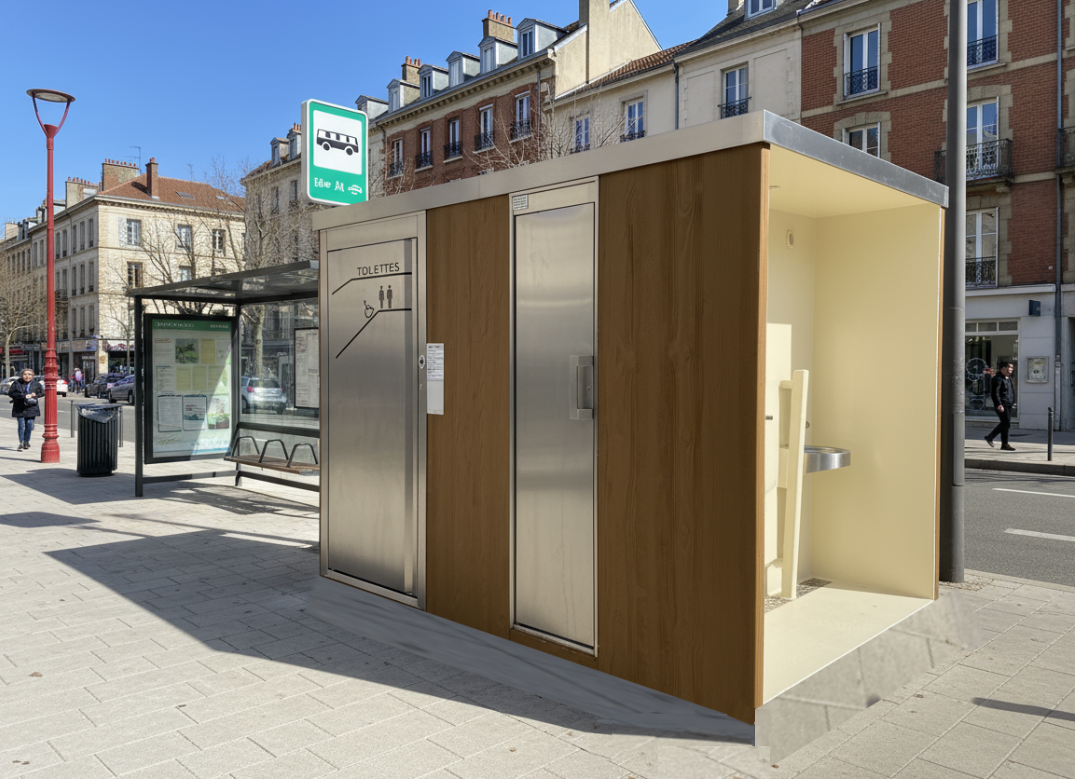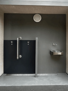 Nous proposons des cellules sanitaires pour personnes à mobilité réduite avec un mur urinoir semi-extérieur.
